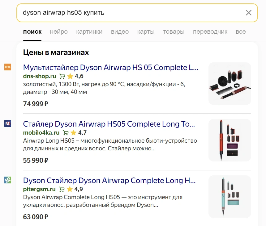 Июнь 2024 года порадовал пользователей Яндекса выходом нового блока под названием «Цены в магазинах». Отображается он в числе первых четырех позиций, а при нажатии на активную ссылку вы сразу попадаете в интернет-магазин. В этой подборке демонстрируются те же предложения, которые публикуются и в товарном блоке.